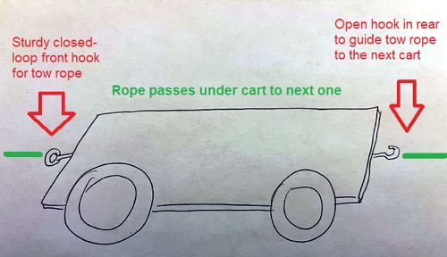 Tow hooks. Your cart must have a strong closed-loop hook (or horizontal "bumper" bar that a carribeeener could clip on to) solidly screwed in somewhere on the front of your cart near the center line, and clearance underneath the cart to the open guide hook in the back of the cart for the tow-rope to pass along to the cart behind you. Tow vehicles will pull four carts at a time up the hill using a 50' rope with carribeener loops tied in, one for each cart.
